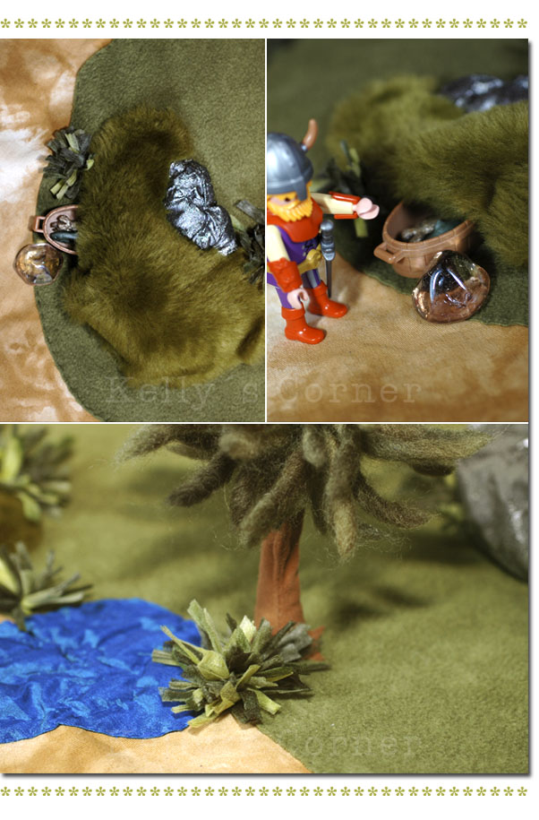 Die Insel ist komplett mit der Hand genäht und ca. 100 x 120 cm groß, damit sie natürlich auch bequem bewohnt und bespielt werden kann. Der Sand besteht aus einem festen, bedruckten Baumwollstoff (einfach nur ausgeschnitten, nicht versäubert). Die Wiese besteht aus grünem Fleece und das höhere Gras aus Teddyplüsch, teilweise mit Zauberwatte unterfüllt und in Falten gelegt, damit es schön hügelig wird. Die Felsen sind mit ein paar Falten versehen, aus mit Silber bedrucktem Jersey genäht und auch mit Zauberwatte gefüllt. Die Grasbüschel habe ich aus eine Art Bändchengarn gebunden. Der Baum war nicht ganz einfach, er kippt leider auch immer wieder mal um, im Inneren des Baustammes steckt eine alte Garnrolle. Die Baumkrone ist aus einem ganz dicken groben Wollgarn. Ich hoffe man kann das auf den Fotos ganz gut erkennen. Und es gibt ein Geheimversteck (rotes Kreuz) in dem die erbeuteten Schätze gleich nach dem Abladen schnell verstaut werden können (siehe Bild unten).