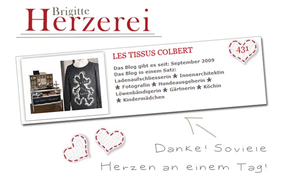 Das war nun aber definitiv der letzte “Herzensaufruf” für meinen Blog… Ihr dürft natürlich schön weiterherzen jeden Tag (MICH freut´s BESONDERS *hüpf)… Und vielleicht schafft es “Les Tissus Colbert” für ein paar Tage mal unter die ersten 10…