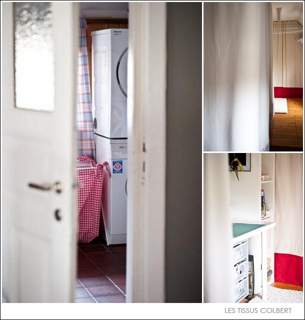 Ich nähe hier unglaublich gerne. Früher habe ich alles immer im Esszimmer aufgebaut. Das hatte einfach den Nachteil, dass es tagelang ganz ungemütlich rund um den Tisch aussah. Dann wurden die Buben großer und interessierten sich besonders für Scheren, Stecknadel & Co. Aus Sicherheitsgründen haben wir dann den “Nähplatz” in die Waschkammer verlegt.